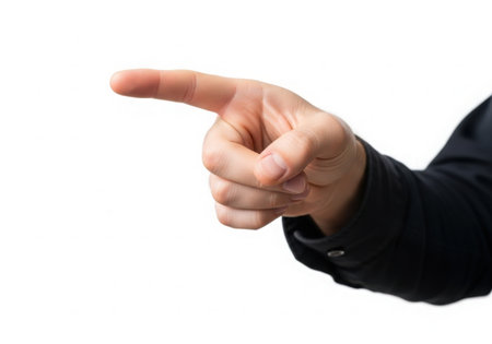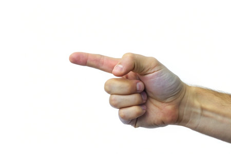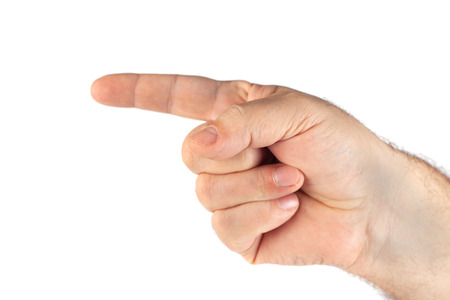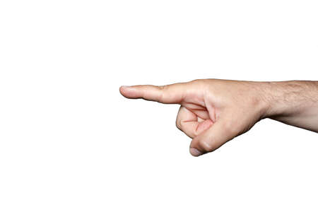 Close-up of male hand showing direction with finger on white background.