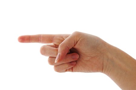 Point sign, Female hand on white background