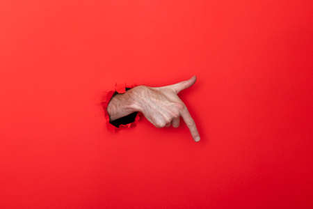 Male caucasian hand through a hole pointing against a red background