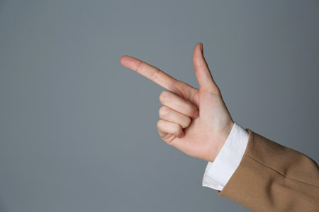 Hand pointing with index finger at something, copy space, gray background.