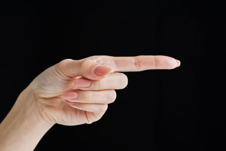 Hand of female gesturing in single pointing finger shape with gray background.