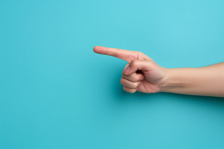 hand pointing finger on blue background. Copy spray for text