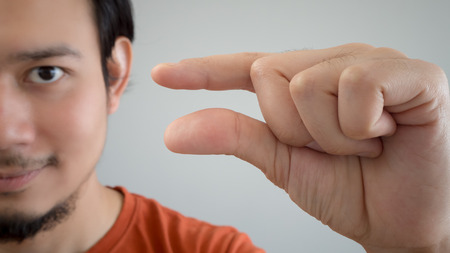 Asian man in red t-shirt is showing tiny thing to the camera.
