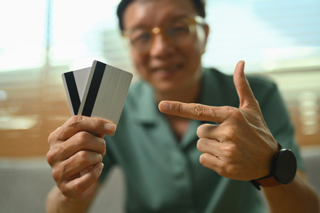 Middle age man pointing finger at credit card, recommending his bank for online shopping or banking