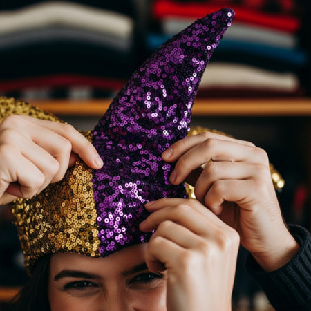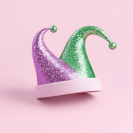 A D illustration of a jester hat adorned with glitter featuring sparkling metallic purple and green tones The hat is set against a minimal background