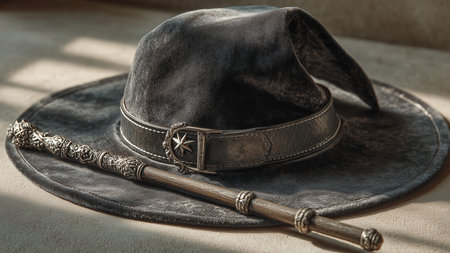A black witch hat with a silver buckle sits on a wooden table by candlelight. AI generation