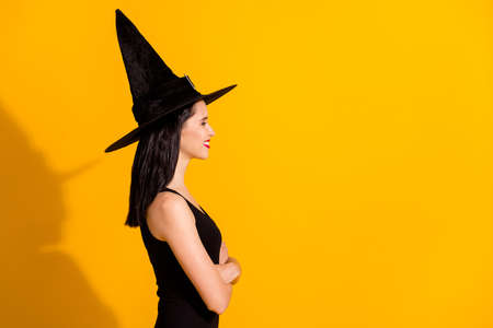 Profile photo of cute lovely young sorceress lady crossed hands beaming smiling prepare enter witch actresses casting wear black headwear dress isolated bright yellow color background