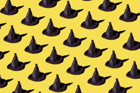 Witch hat with shadow multiplied on trendy yellow background. Minimal abstract Halloween and horror concept.