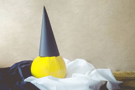A big autumn orange pumpkin with black paper hat. Fall, Halloween and Thanksgiving concept. Copy space for text. Image for background usage.