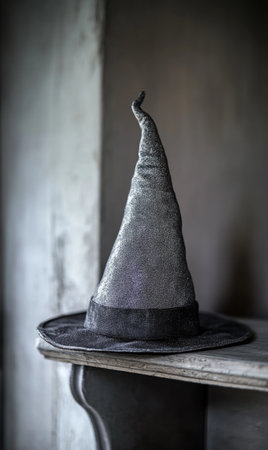 A silver and black wizard hat, shimmering with magic, placed on a shelf