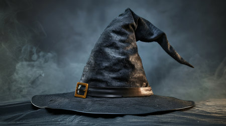 Worn witch hat with a buckled band is sitting on a dark wooden surface. Eerie smoke fills the background, creating a spooky atmosphere