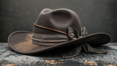 A bold composition featuring a classic brown hat placed on a dark textured surface, creating a refined and moody aesthetic.