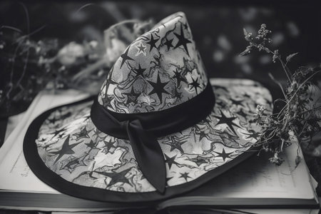 The Witch's Hat in vintage style. Halloween illustration. Monochrome drawing, magical decor. AI generated