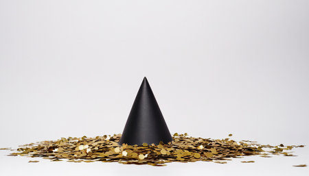 A black conical party hat stands upright in the center of a pile of scattered gold confetti. The confetti is small and circular with a metallic sheen, creating a festive and sparkling texture around the hat. The background is a plain white, isolating the and emphasizing the contrast between the dark hat and the bright confetti.