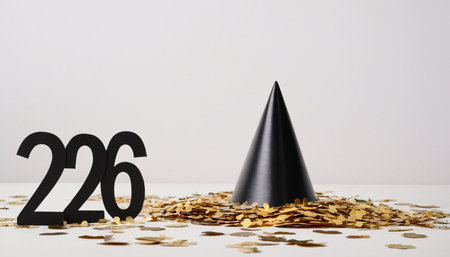 Black numbers 226 stand on a white surface next to a pile of gold confetti. A black party hat is placed on of the confetti pile. The background is a plain white wall. 226, numbers, black numbers. black numbers 226 with party hat and gold confetti.