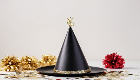 A black party hat with a gold glitter band and a gold ribbon bow sits on a black plate. Scattered gold confetti covers the white surface around the hat. To the left are three gold pom-poms, and to the right is a red pom-pom. The background is a plain, light color.