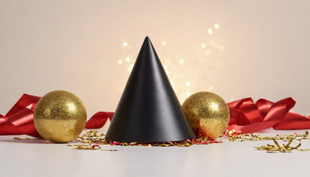 A black party hat is centered on a surface covered with gold and red confetti. Two glittery gold spherical ornaments flank the hat, and a red satin ribbon is draped around them. The background soft, blurred bokeh lights in warm tones.