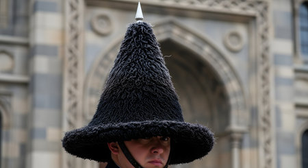 A close-up portrait of a ceremonial guard wearing a distinctive, tall, conical hat made from black karakul (Astrakhan) fur. The traditional headwear, part of a formal uniform, is a striking symbol of cultural and historical significance. The guard's expression is serious and stoic.