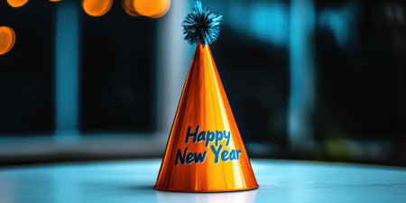 Festive new year hat with blue tassel against blurred lights background.
