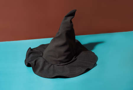 Black witch hat on brown and cian background hard light.