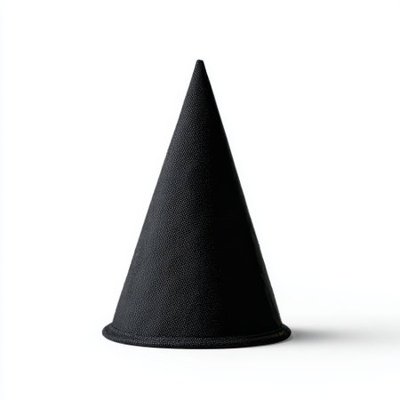 Black party hat with a cone shape standing alone against a neutral white background; perfect for birthday celebrations and festive occasions.