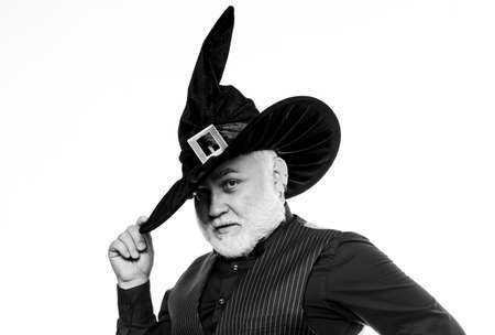 Wizard costume hat Halloween party. Senior man white beard celebrate Halloween. Magician witcher old man. Magic concept. Experienced and wise. Magic spell. Halloween tradition. Cosplay outfit