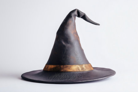 Pointed wizard hat made of dark leather with golden ribbon standing on plain white background