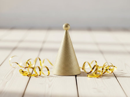 Party hat with golden ribbon on white wooden background with copy space.
