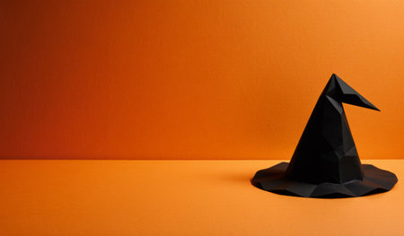 A black witch hat lies on an orange surface, creating a striking contrast. This simple yet eye-catching arrangement captures the spirit of Halloween and festive celebrations.