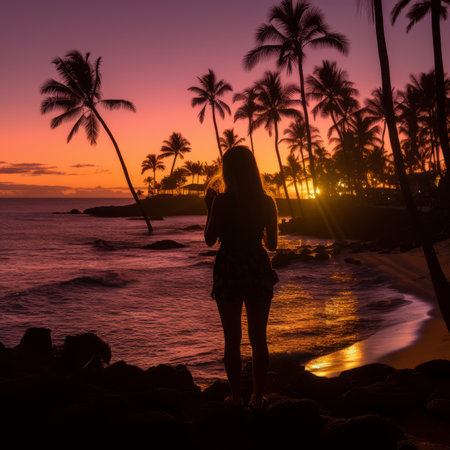 silhouette of a woman standing on the beach at sunset with palm trees in the background