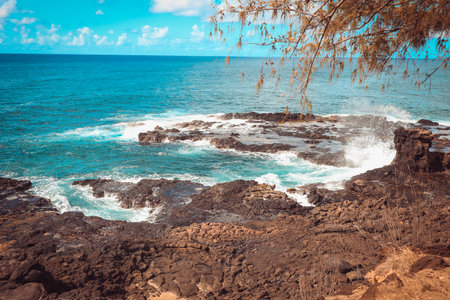 Waves crashing on Shipwreck beach as viewed from Poipu point on island of Kauai Hawaii on clear sunny day against blue skies