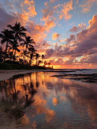 Experience the serene beauty of a tropical beach at sunset, where palm trees sway gently in the breeze and gentle waves caress the shore.