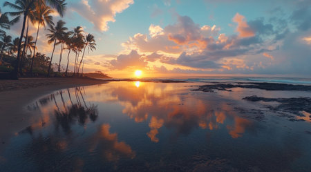 Beautiful sunset on the beach in Kailua-Kona, Hawaii, with palm trees and reflections of water in the sky. 8K, real photo, photography in the style of Fiji. --ar 9:5 --v 6.1 Job ID: 3c062f74-35cf-4e56-87d7-b18999a3f72c