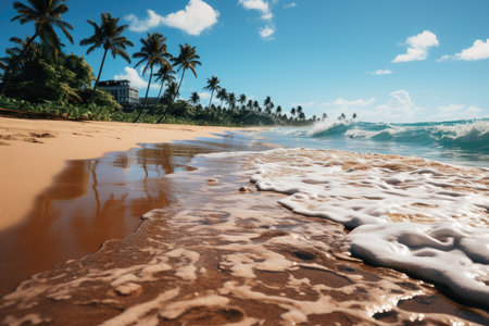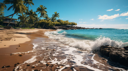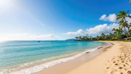 Sunny resort in Hawaii with golden sand, clear blue water, and palm trees under a bright sky