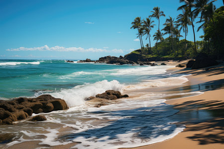 Landscape tranquil beach. Hawaii background, tropical Hawaiian paradise with palm.