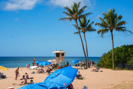 People enjoy tropical paradise beach views in Hawaii on sunny day