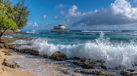A scenic view of a tropical paradise with powerful ocean waves breaking on a rocky, sandy shore. A catamaran tour boat is anchored in the calm blue water under a partly cloudy sky.