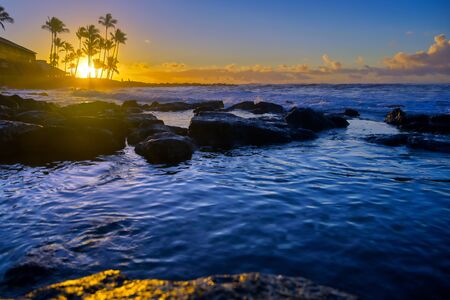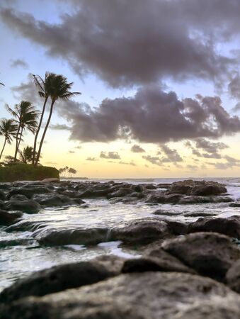 Hawaiian beach with palm trees and lava rocks. Beautiful island sunset by the ocean. Tropical travel vacation.
