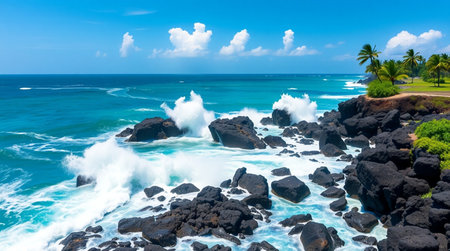 The untamed beauty of the caribbean coast is captured in the crashing waves against the azure sky, while palm trees sway and shoals of fish dance beneath the crystal clear water
