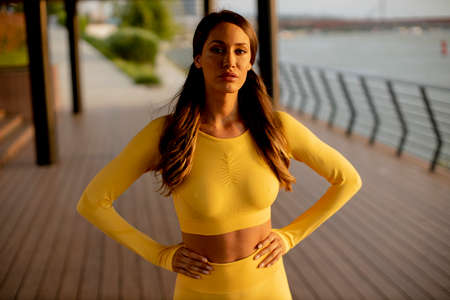 Fit young hispanic female athlete in sportswear listening to music with wireless headphones while taking a break from her early morning run along a promenade