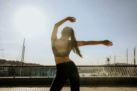 Back view of a woman stretching her arms and legs before her early morning exercise at a local lake park with morning sunrise sky, mountains and lake background, room for copy space