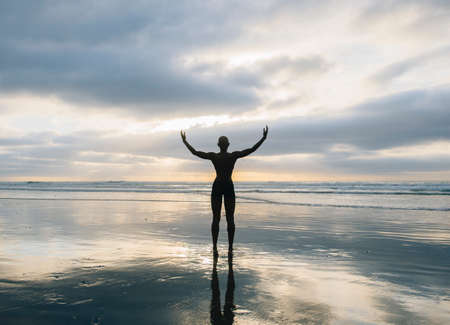 How can you not be motivated by this view. Rearview shot of an unrecognizable athletic young woman standing with her hands on her hips during a workout on the beach.