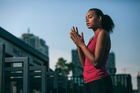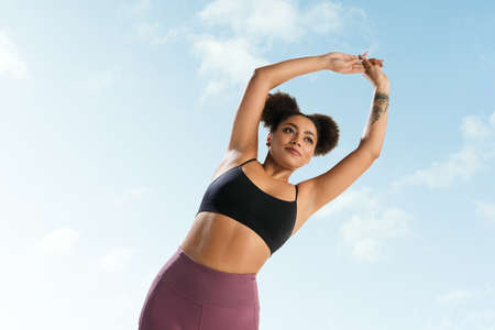 Preparing. Portrait of young female fashion model on blue sky background. Beautiful african woman practicing, training. Style and beauty concept, sport, lifestyle, summer mood. Copyspace for ad.
