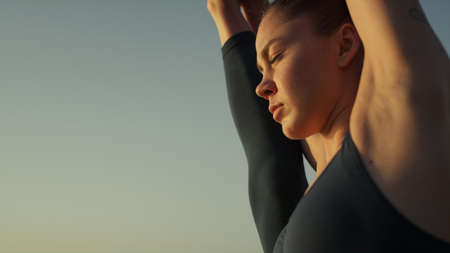 Flexible woman practicing gymnastic twine at dusk close up. Barefoot girl training yoga on nature summer evening. Sporty lady holding leg by hand stretching outdoor. Healthy workout on beach.