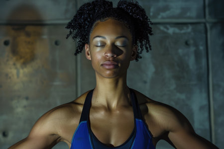 A woman stands with her eyes closed and hands on hips, exuding confidence and tranquility in a serene moment of self-assurance.