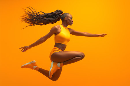 A skilled athlete performs a breathtaking jump, showing strength and agility while dressed in a vibrant orange outfit. The bright yellow background enhances the dynamic movement and energy.