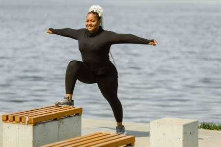 Happy african american woman wearing sportive clothes showing plus size hips. Body positive concept. Blue light on background