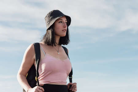 horizontal portrait of a pretty young hispanic latin girl white in pink posing with her hands on her black hat looking to the side with an astonished face staring at a valley with arid vegetation
