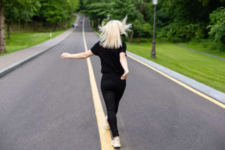 Joyful young lady in casual clothes walking along asphalt road in countryside, hitchhiking for ride outdoors. Lovely millennial woman traveling alone by autostop