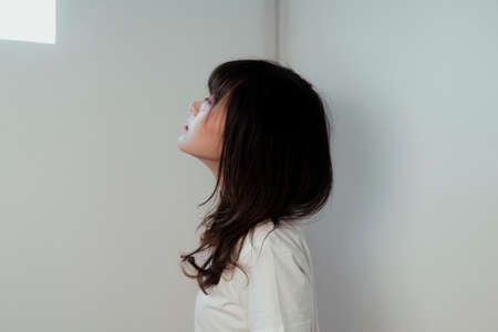 Thai girl looking to outside the window, think about the way to let herself be free from this world.